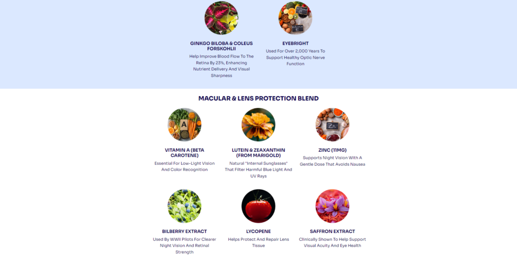 Some of the ingredients are also associated with supporting structures of the eye such as the retina and macula, which play an important role in visual function.